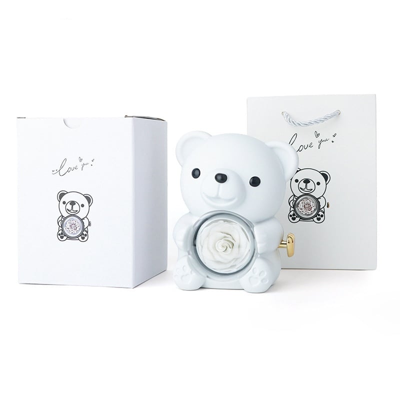 Rotate the golden heart-shaped knob on the bear's chest to reveal a secret jewelry box behind the preserved rose.Inside rests a delicate heart-shaped necklace—a beautiful second surprise that deepens the moment of discovery.