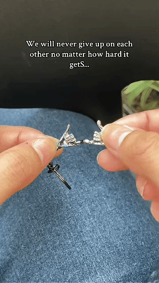 This pair of keychains features two sculpted hands that fit perfectly together 🤝, a sweet daily reminder of your unbreakable bond. The silver and gold design creates a perfect contrast, making them a stylish token of love for you and your partner ❤️.